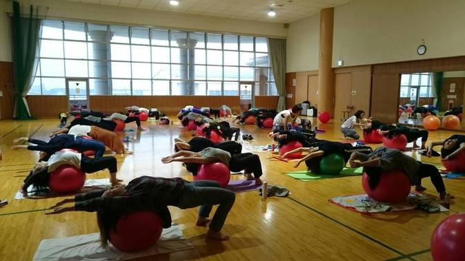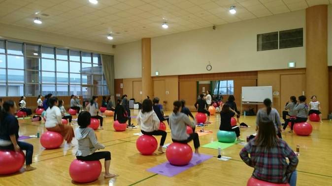 体力メンテナンス協会の福田真依子先生をお招きし、バランスボールを使用した有酸素運動・骨盤矯正のやり方を教えていただきました。