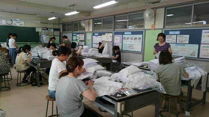 境川中学校 家庭科室にて子ども達が学校給食で使用しているすべてのエプロンの点検、修繕を行いました。今後も気持ち良く使ってほしいと気持ちを込めながら、委員の皆さんが作業して下さいました。