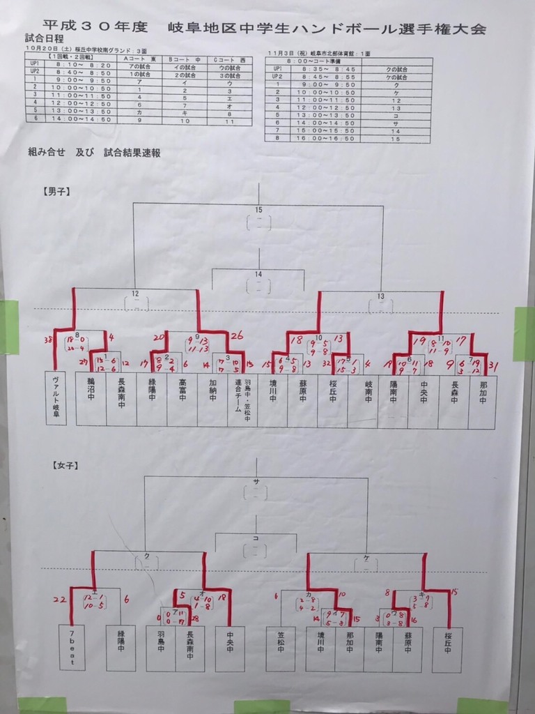 平成30年10月20日 岐阜地区大会が桜丘中学校グランドで開催されました。 男子は15チームの参加でトーナメント戦です。 1回戦めは蘇原中学校との対戦でした。 1回戦めは緊張のせいかなかなかいつもの調子が出ずハラハラする試合でしたが 15-13で勝利することができました。 2回戦めは桜丘中学校との対戦でした。 18-13で勝利しました。